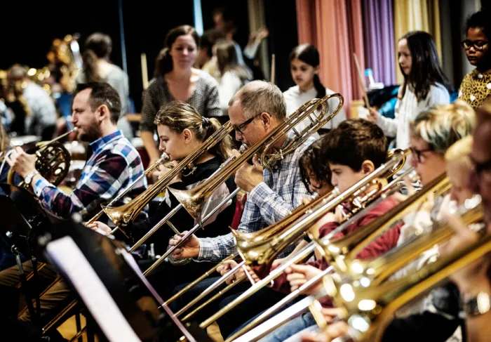El Sistema i Malmö har orkesterrepetitionen. På bilden ser vi bland annat trombon, valthorn, tuba och slagverk.
